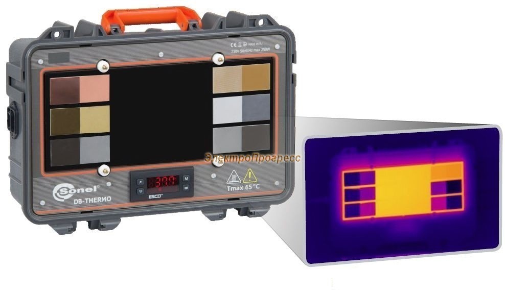 Стенд выполнен в виде переносного пластикового кейса с габаритными размерами 330x260x140 мм и массой около 1 кг, оснащен отдельным кабелем питания и защитным кожухом. Рабочая поверхность стенда (матовый затемненный алюминий) обладает коэффициентом эмиссии 0,96 и состоит из различных образцов распространенных материалов с матовой и полированной поверхностью. Пользователю доступна установка температуры рабочей поверхности стенда от +40°С до +60°С, которая отображается на встроенном ЖК-дисплее.
